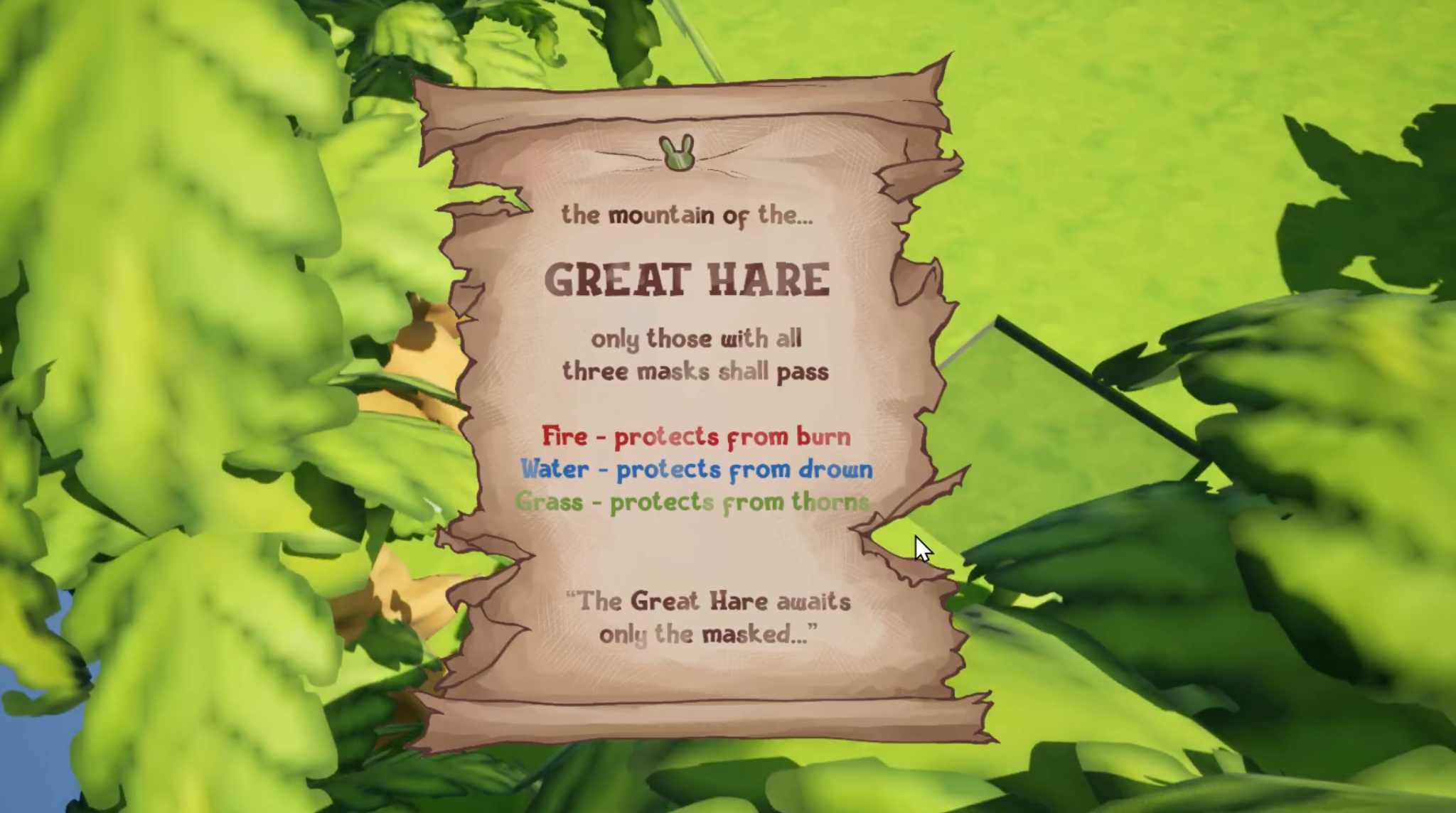 In this 3D platformer, you play as an adventurous bunny tasked with crossing dangerous biomes in order to reach the summit of a Great Mountain. The player must collect three masks to gain abilities needed to survive these biomes and complete their task.